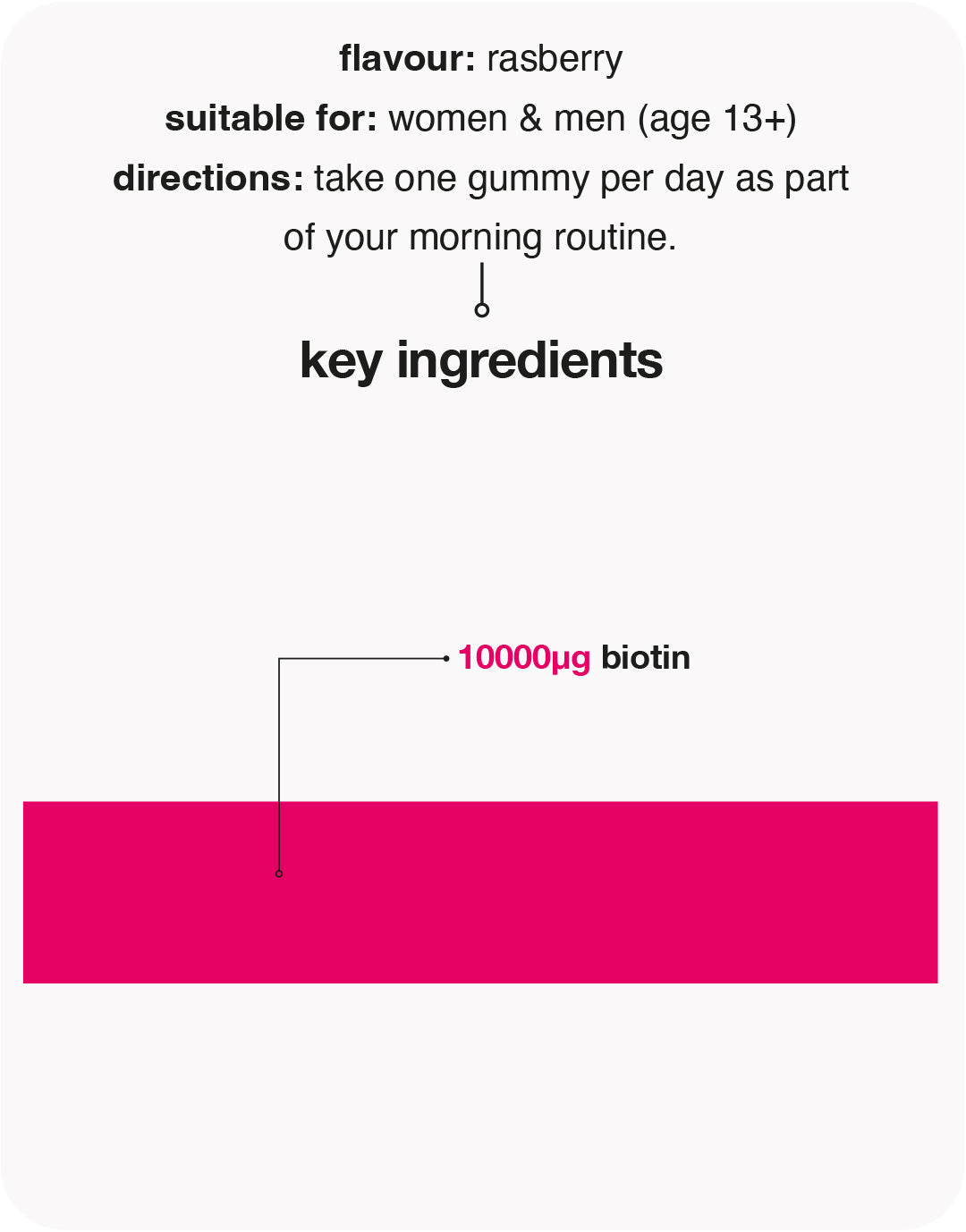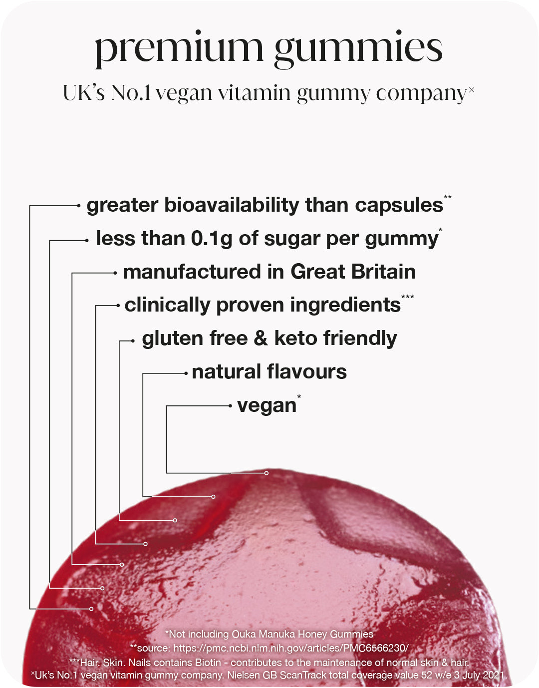 Each delicious Biotin vegan gummy contains a generous 10,000μg per serving offering a wealth of health benefits. Biotin is clinically proven for not only skin and hair but its benefits also extend to metabolism as well as normal psychological function.