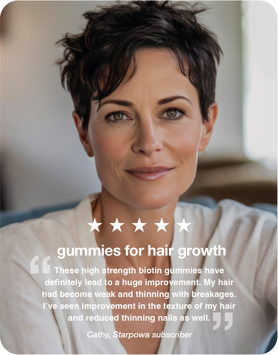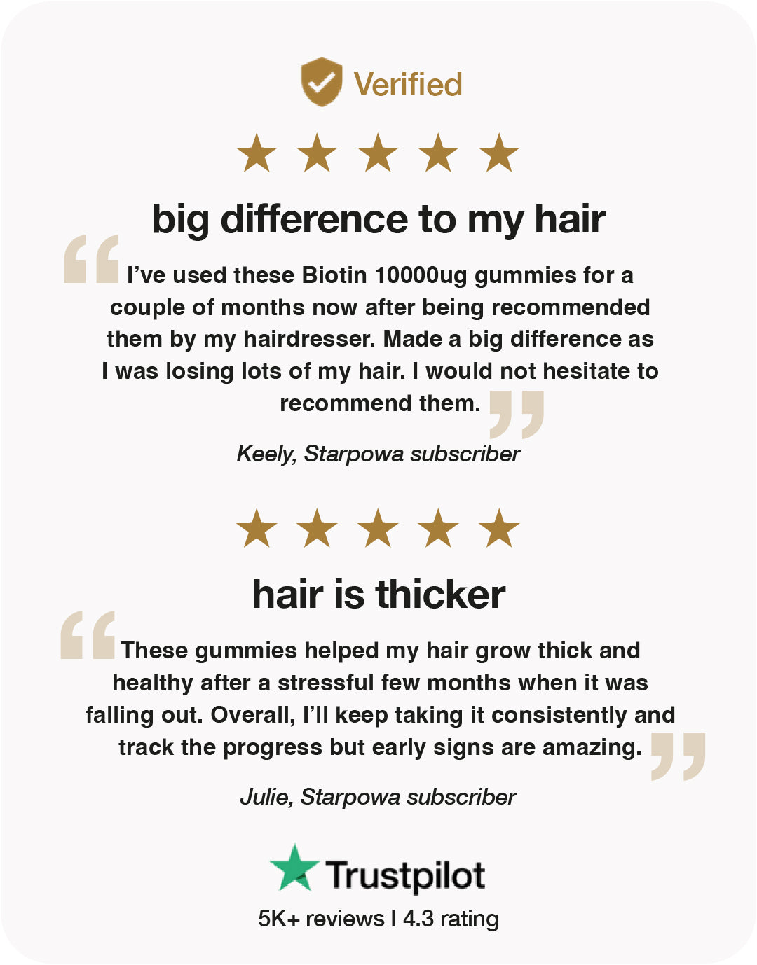 Biotin comes from the ancient Greek word “biotos,” which means “life” or “sustenance.” Each of Starpowa's gummies are vegan-friendly, contain less than 0.1g of sugar per gummy, and are naturally sweetened using plant extracts. All of our products are formulated and manufactured in the UK to the highest standards.